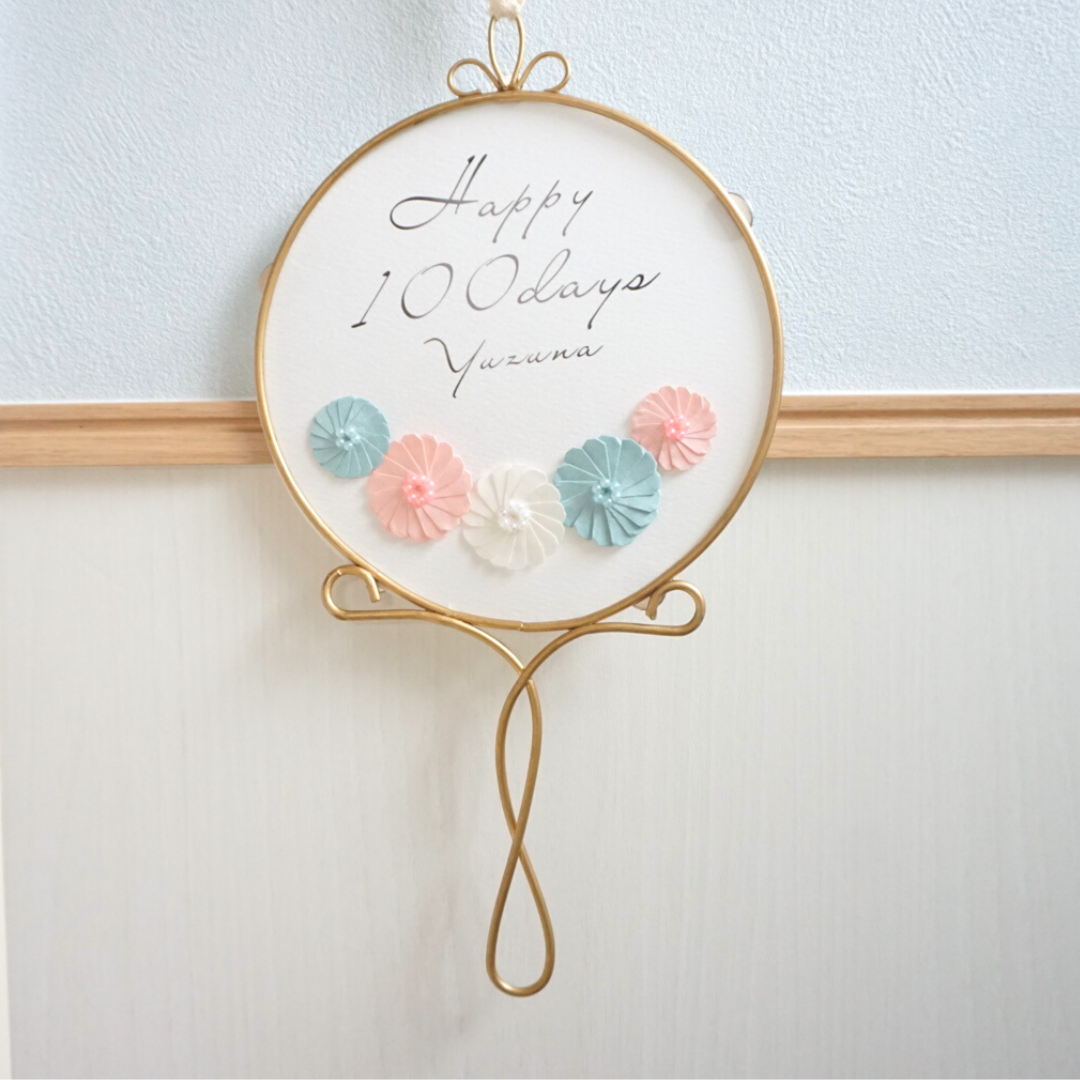 お子さまのお名前を印刷したファインペーパーと可愛らしい折り紙のお花をセットにした飾りです。